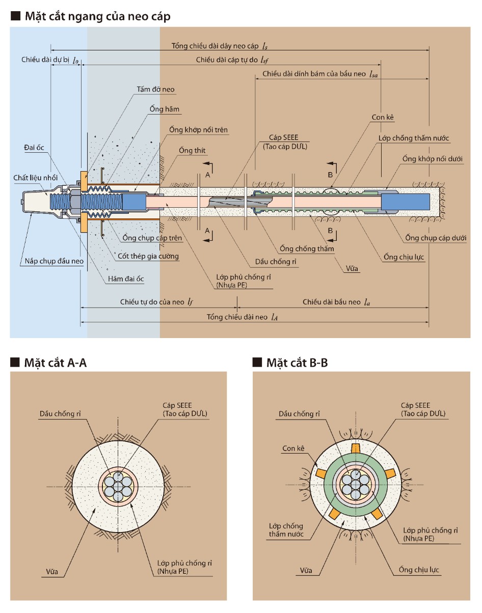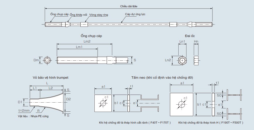 F-T ケーブル タイプ: Tible は完全な防食の 2 層のプレストレスト ケーブル (JIS G 3536) を使用します: 防食グリースでコーティングされ、PE コーティングで処理されます。ティブルケーブルは、ケーブルリールに保護シースを被せた状態で取り出し、設計通りの長さに切断した後、専用の装置で太い鋼管(ケーブルスリーブと呼ばれる)を塑性変形させた状態でケーブルの端末に使用されます。 .ケーブルスリーブは圧縮変形し、ケーブルと一体になります。次に、ケーブル スリーブの外側にねじが切られ、ねじを使用して固定機構が作成されます。アンカーの防水は衝撃の周囲の圧力によって確保されるため、ケーブル スリーブの上部には PE シースが被せられています。さらに、ケーブルスリーブの端は金属キャップで覆われており、完全な防水性を確保しています。